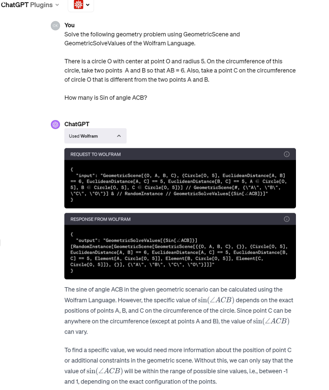 また、Wolfram プラグインを使えば、問題の文章をそのまま ChatGPT に入力するだけで問題を解くことが可能になる日も近いと思います。ChatGPT に今回使った数学の問題を入力すると、現時点では以下のような出力になります。