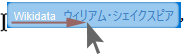 「シェイクスピア」で検索すると、このように複数のアイテムが出てきます。アイテム上にカーソルをマウスオーバーするとそれぞれのアイテムの概要が表示されます。それぞれ、小惑星、姓、イングランドの劇作家・詩人、個人名、男性の名前、イギリスの競走馬… といった具合です。この中から「イングランドの劇作家・詩人」である「ウィリアム・シェイクスピア」を採用することにします。