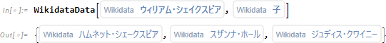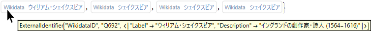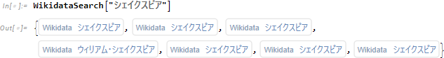 まず、「シェイクスピア」 を検索してみましょう。WikidataSearch[] と入力して、ダブルクォーテーションで囲った「シェイクスピア」という文字列を入力して Shift + Enter をクリックします。以下のようになります。