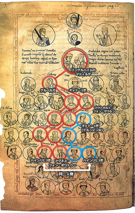 この 「ハインリヒ3世」 は、なぜか、家系図の下から3段目、右から3人目としても登場しています。つまり、「ハインリヒ3世」 は母系からも父系からも二重にあらわれているわけです。母系からは、「ゲルベルガ」、「マティルド・ド・フランス」、「ゲルベルガ・フォン・ブルクント」、「ギーゼラ」のラインで5代。父系からはザリエル朝の「コンラート」の妻「リウトガルト・フォン・ザクセン」からのラインで4代。歴代皇帝をあらわすのが目的ならば、ハインリヒ3世は父系でつながっているので、母系は、省略してもいいわけです。この家系図では母系ラインが (2つも!)あらわされています。「ハインリヒ3世」の母系ラインをあえて出している点は、製作者の意図、つまりリウドルフィング家のつながりを強調したかったという思いが感じられます。
