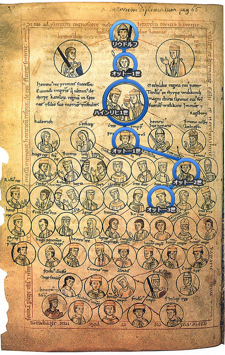 「オットー3世」 から父系を5世代さかのぼって家系図と一致するのを確認してみましょう。