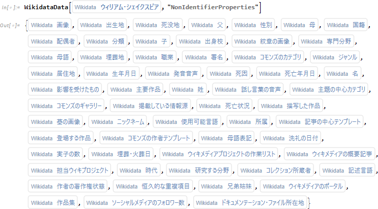 「ウィリアム・シェイクスピア」というアイテムには、どのようなプロパティが登録されているかを調べます。WikidataData の括弧の中に、上記でコピーしたアイテム「ウィリアム・シェイクスピア」をペーストしたら、カンマに続けて、プロパティを取り出すための引数 "NonIdentifierProperties" を指定します ("Properties" でも良いですが他のデータベースの ID も多数出力されますので表示が煩雑になります)。入力したら Shift + Enter をクリックします。