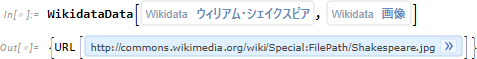 「ウィリアム・シェイクスピア」アイテムの 画像を取得するにはどうしたらよいでしょう?WikidataData 関数の第2引数に Wikidata プロパティの1番目に出てくる「画像」プロパティを 使う方法と、直接 "Image" を指定する方法があります。プロパティの「画像」を使った場合は、その画像の URL が取得されます。