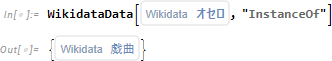 第2引数の条件は、{} 内にカンマで区切ることで複数指定できます。シェイクスピアの作品で、かつ、 1600 年~1620年の間に出版された戯曲を調べたい場合はどうしたらよいでしょうか?まず、前に調べた「ウィリアム・シェイクスピア」の「主要作品」の1つ「オセロ」を使ってその上位概念とプロパティを調べます。「オセロ」は「戯曲」という上位概念に属することがわかります。