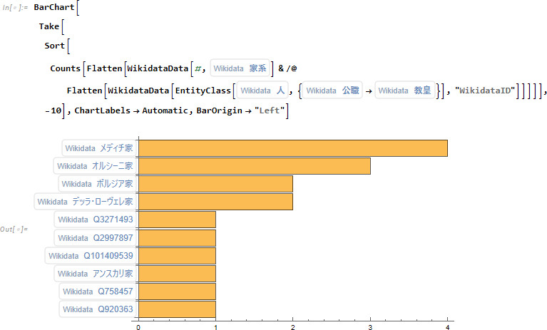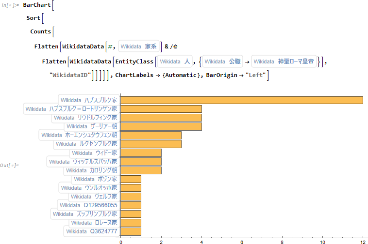 カテゴリに分けてカウントするということは、個々の事象のドラマ性は無くなりますが、抽象化された全体像を把握できることになります。「公職」 が 「神聖ローマ皇帝」 である 「人」 の集合をもとめて、それら全ての 「家系」 プロパティを取得します。取得した結果を Counts 関数でカウントし、Sort 関数で並べ替えたあと、BarChart で横向きにあらわします。