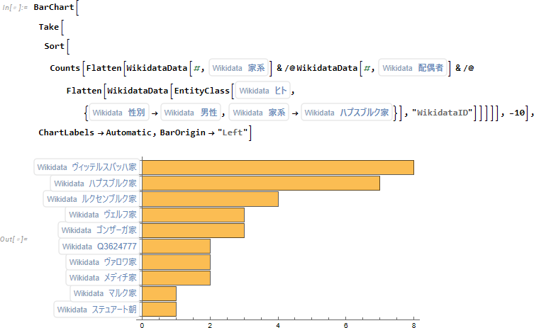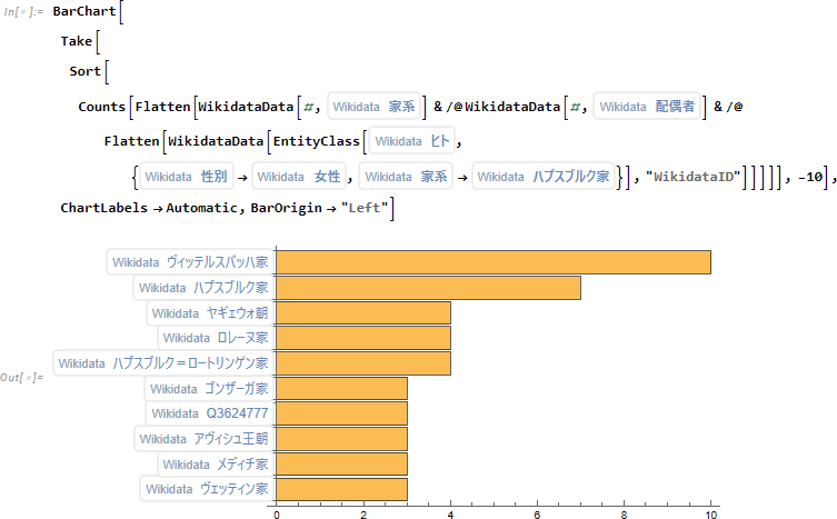 ハプスブルク家出身の「男性」は、どこの家系から多く配偶者を得たか?上位10件を取り出すために Take[ , -10] を使っています。