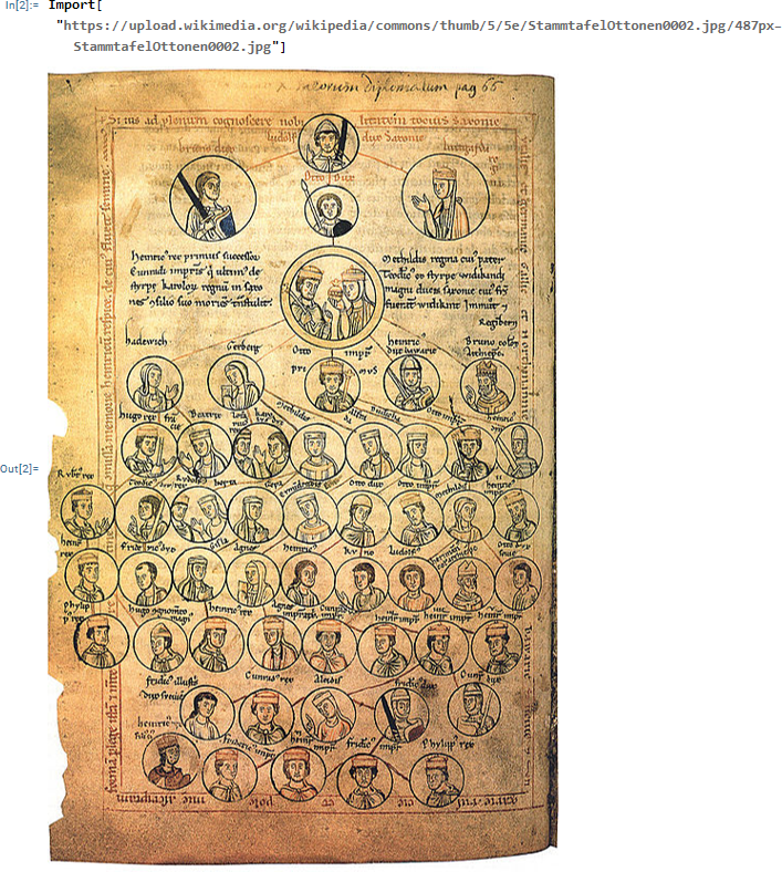 Wikimedia コモンズに公開されている「リウドルフィング家」の家系図を見てみましょう。Wikimedia コモンズの画像を Import 関数で取り込みます。12世紀後半に作成された神聖ローマ帝国ザリエル朝の家系図です。リウドルフィング家の祖「リウドルフ」 (ザクセン公) にはじまり、最下段の左から2人目のホーエンシュタウフェン家の最後の皇帝「フリードリヒ2世」までの世襲による神聖ローマ皇帝のつながりがあらわされています。頭の部分が丸いオレンジ色の四角い帽子をかぶった男性はすべて歴代皇帝 (またはフランス王) です。一番上の「リウドルフ」 から下って上から2つ目の中央は「オットー1世」 (ザクセン公)、上から3つ目の大きい二重丸で囲まれた2人は、「ハインリヒ1世」と妻の「マチルデ」です。