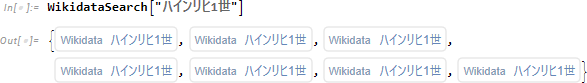 Wolfram 言語で言うエンティティ (実体) のことを、ウィキデータではアイテム (項目) といいます。ウィキデータのアイテムを Mathematica に取り込むには WikidataSearch 関数を使います。ウィキデータには日本語で登録されている情報が豊富に登録されているので、多くの場合、引数に日本語が使えます。海外の人名をアルファベットに直す必要がないので、とても便利です。ただし、必ずしもすべてのアイテムやプロパティが日本語化されている訳ではありません。日本語化されていないアイテムやプロパティは、識別子 (Q***、P***) で表示されます。必要に応じて Language->"English" オプションを使って言語を切り替えることができます。