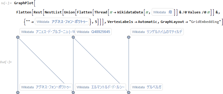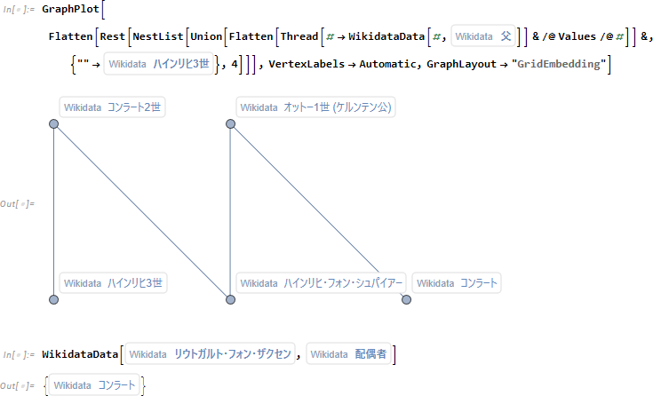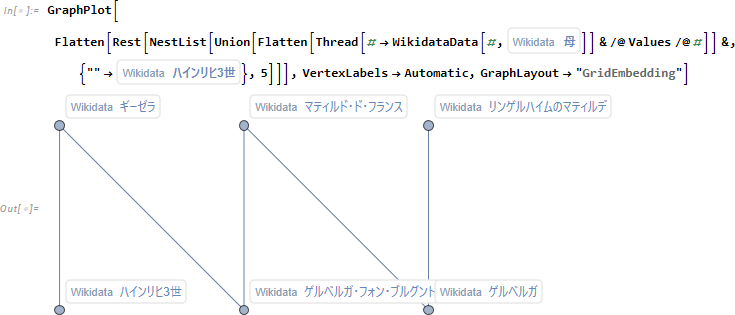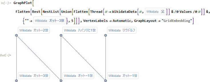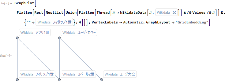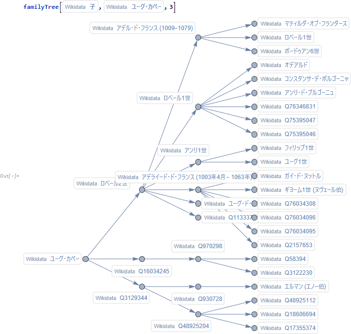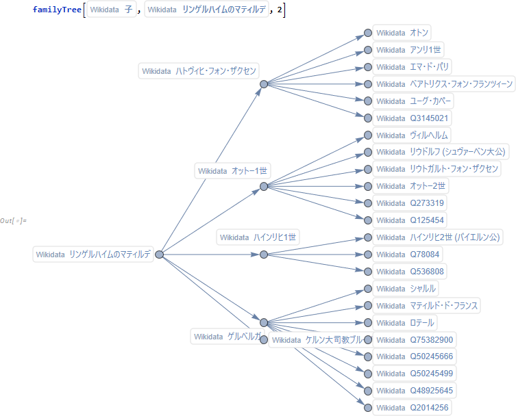 ウィキデータで得られた情報をルールのリスト形式、すなわち、 {a -> b, a -> c, a -> d, ... } の形にすることで、様々なグラフにあらわすことができます。以下に「familyTree」という関数を作りました。