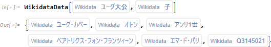 WikidataData 関数で「ユーグ大公」 の 「子」 をとりだします。「子」には男女の区別はありません