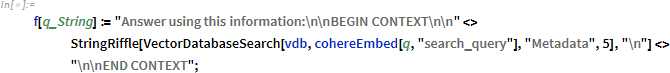 バージョン 14.1 で RAG をサポートする関数 (LLMPromptGenerator、SemanticSearch、VectorDatabaseSearch など) が追加されたので、それを使って修正します。