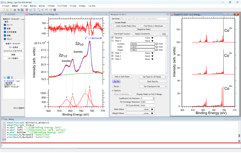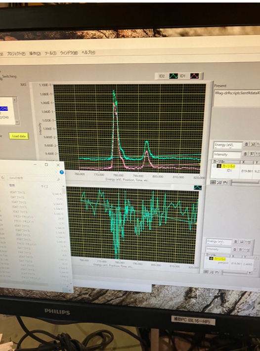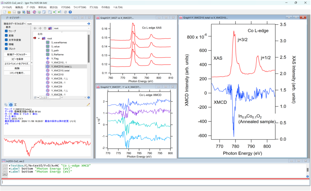 先日、高エネルギー加速器研究機構 (高エネ研) の放射光実験施設 Photon Factory(PF) のBL-16A にて、酸化物磁性材料の電子構造解析を実施いたしました。実験では、インジウム酸化物 (In2O3) にコバルト (Co) 元素を 10% 程度添加した材料 (Co-doped In2O3) に軟X線を照射し、その吸収挙動をスペクトルとして観測しました。この吸収スペクトルの構造からは、物質を構成する元素の化学結合状態や磁気状態を詳細に読み取ることができます。得られた吸収スペクトルの構造的特徴を理論計算と照合することで、物質の磁性の起源を探ることが可能です。この解析には高度な精密性が要求されるため、従来は非常に困難な作業でしたが、Igor Pro を活用することで、これらの課題を効率的に解決することができました。 今回の実験では、ビームライン担当の先生からの手厚いご支援に加え、高性能な Igor Pro を活用できたことで、重要な知見が得られました。具体的には、Co-doped In2O3 の磁性安定化には、試料表面の格子欠陥の導入が有効である、という示唆を得ることができました。この発見は、今後の材料開発における重要な指針となると考えています。