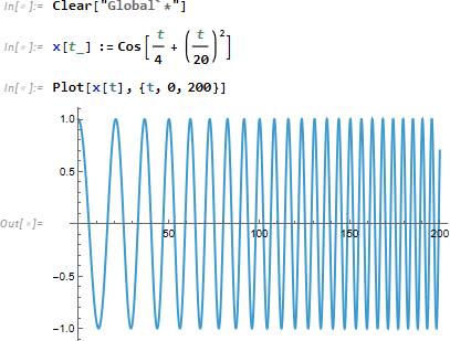 今回は実信号 x[t] をチャープ信号とし、次のように定義します。