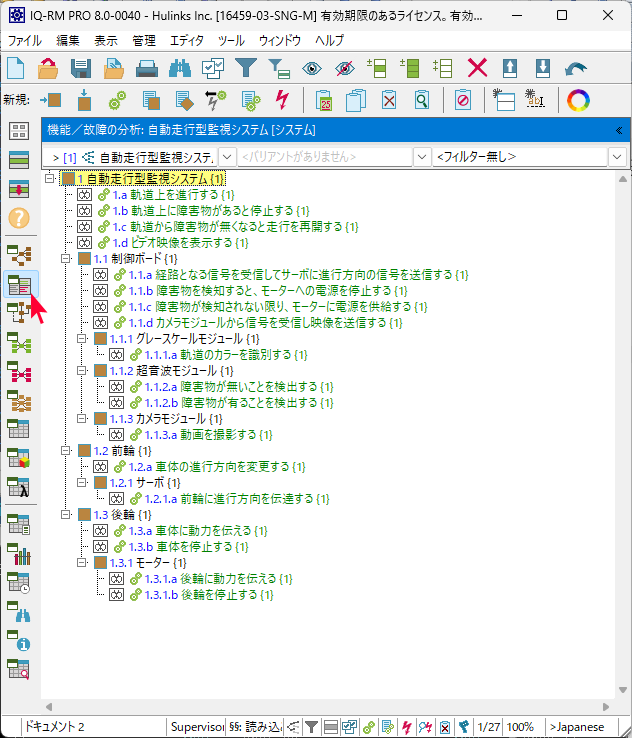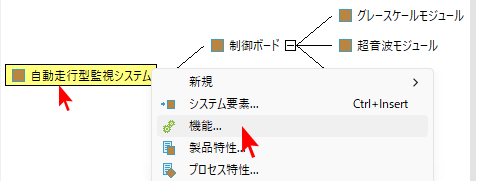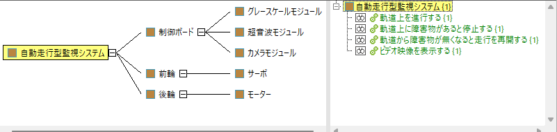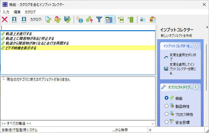 入力したらリターンキーを押します。構造エディタの右側に入力された機能がリスト表示されます。システム要素「自動走行型監視システム」に4つの機能がアンカー設定されたことを確認できます。