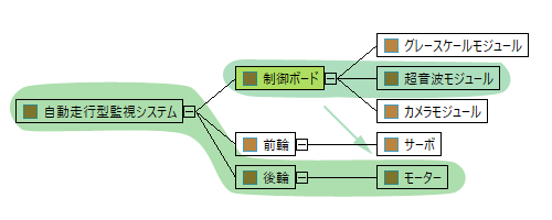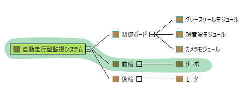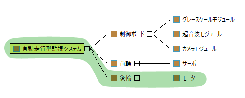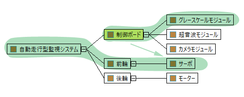 超音波モジュールで障害物が「無い」ことを検出し、その結果、モーターに電源が供給され、後輪に動力が与えられることで、自動走行型監視システムが軌道上を進行するという原因から影響までのつながりが、機能ネットを通じて矛盾なく説明されていることがわかります。