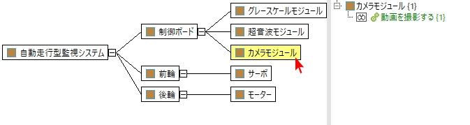 最後に「自動走行型監視システム→制御ボード→カメラモジュール」ラインを検討します。構造エディタで「制御ボード」を選択します。