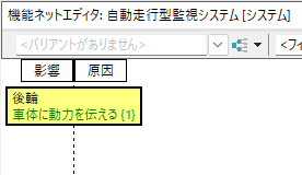 「機能ネットエディタ」を表示します(「車体に動力を伝える」機能のアイコンをダブルクリック)。以下の図のように「車体に動力を伝える」の上に「影響」「原因」が表示されます。これは、「後輪」が現在の「フォーカスエレメント」になっていることを示します。