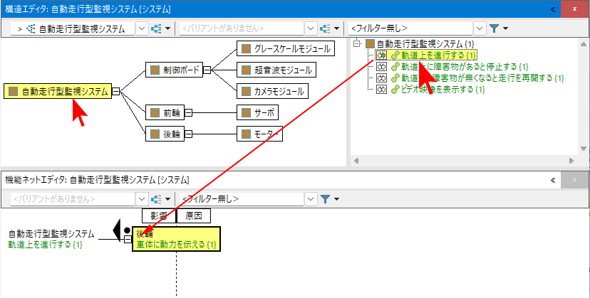 構造エディタで「自動走行型監視システム」を選択して、表示される機能の中から「軌道上を進行する」を選択して、機能ネットエディタの「後輪」の先頭付近までマウスをドラッグします。カーソルが三角と黒丸の形状に変わったらマウスボタンを離します。これで、後輪の影響となる機能として「軌道上を走行する」が設定されました。