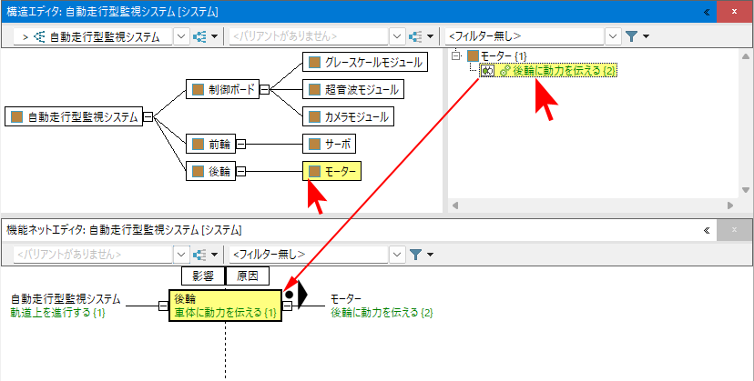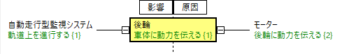 「後輪」の「影響」となるシステム要素は「自動走行型監視システム」です。「自動走行型監視システム」には4つの機能が設定されていますが、このうち、「車体に動力を伝える」に関係するのは「軌道上を進行する」になります。「原因」となるシステム要素は「モーター」です。モーターの機能は「後輪に動力を伝える」です。