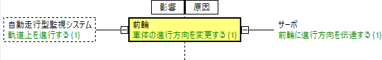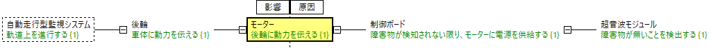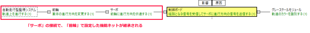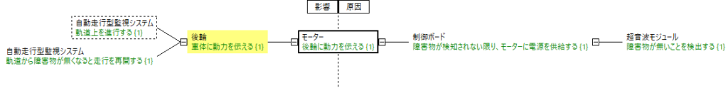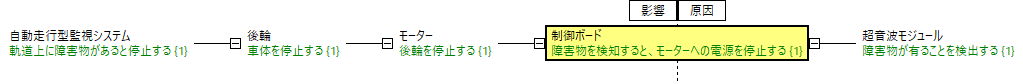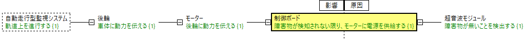 さて、「制御ボード」の「原因」は、「グレースケールモジュール」の「軌道のカラーを識別する」です。一方、「影響」は、構造ツリーに従って「自動走行型監視システム」の「軌道上を走行する」で良いでしょうか?