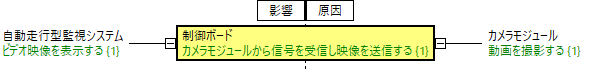 フォーカスエレメントに「制御ボード」の「カメラモジュールから信号を受信し映像を送信する」を指定して、影響には「自動走行型監視システム」の「ビデオ映像を表示する」を、原因には「カメラモジュール」の「動画を撮影する」をそれぞれ接続します。