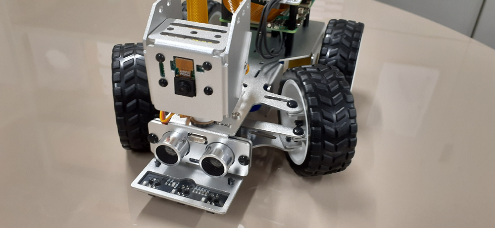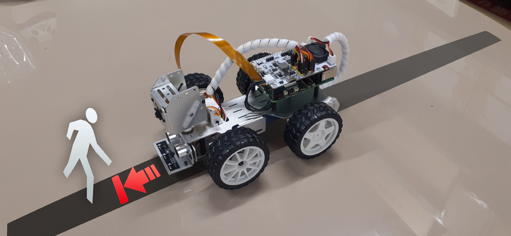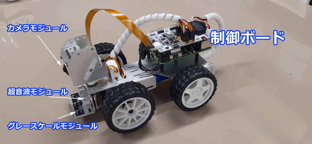 | 自動走行型監視システムモーター | 軌道上を進行する | 軌道上に障害物があると停止する | 軌道から障害物が無くなると走行を再開する | ビデオ映像を表示する | 後輪 | 車体に動力を伝える | 車体を停止する | 前輪 | 車体の進行方向を変更する | モーター | 後輪に動力を伝える | 後輪を停止する | サーボ | 前輪に進行方向を伝達する | 制御ボード | 経路となる信号を受信してサーボに進行方向の信号を送信する | 障害物を検知すると、モーターへの電源を停止する | 障害物が検知されない限り、モーターに電源を供給する | カメラモジュールから信号を受信し映像を送信する | グレースケールモジュール | 軌道のカラーを識別する | 超音波モジュール | 障害物が無いことを検出する | 障害物が有ることを検出する | カメラモジュール | 動画を撮影する |