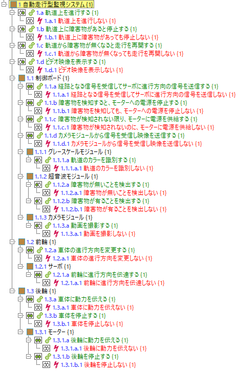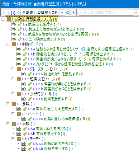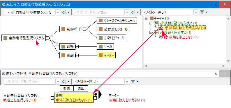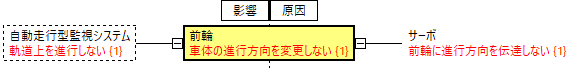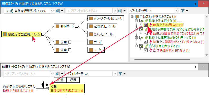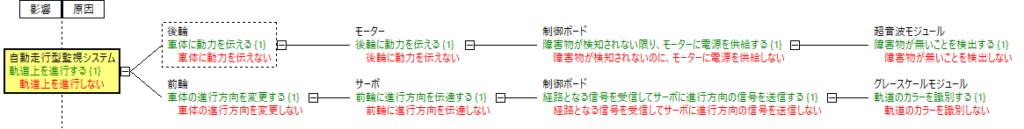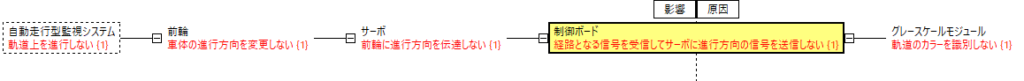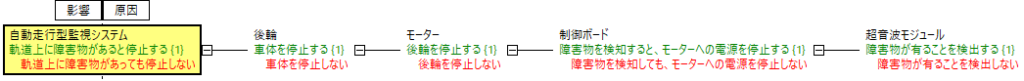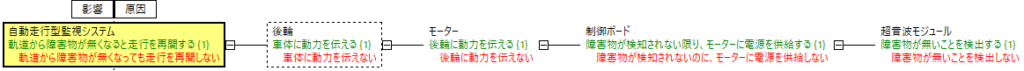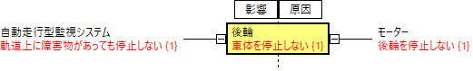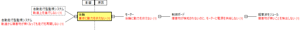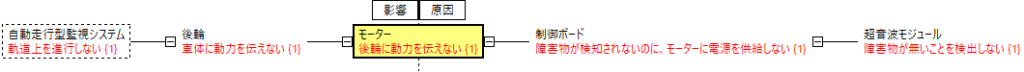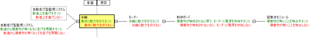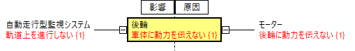 「車体に動力を伝えない」の「影響」となるシステム要素は「自動走行型監視システム」です。ここには4つの故障が設定されていますが、このうち、「後輪」に関係するのは「軌道上を進行しない」になります。「原因」となるシステム要素は「モーター」です。モーターの故障は「後輪に動力を伝えない」です。