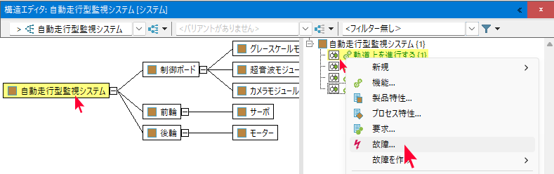 APIS IQ では、故障は、機能に対してアンカー設定します。まず、構造エディタで「自動走行型監視システム」を選択したら、そこに記載されている「機能」のいずれかを右クリックして「故障」を選択します。