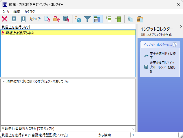 ダイアログが表示されますので、「軌道上を進行する」という機能に対して、「軌道上を進行しない」という故障を記述します。リターンキーを押すと、下の欄に入力した内容が登録されます。