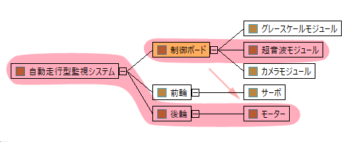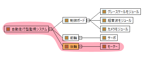 「故障」と「故障」の間に関係を構築してゆきます。まず、「自動走行型監視システム→後輪→モーター」ラインです。
