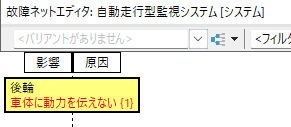構造エディタで「後輪」を選択して、先ほど作成した故障アイコンをダブルクリックします。故障ネットエディタに「車体に動力を伝えない」が表示されます。「車体に動力を伝える」の上に「影響」「原因」が表示されます。これは、「後輪」が現在の「フォーカスエレメント」になっていることを示します。
