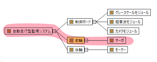 次に「自動走行型監視システム→前輪→サーボ」ラインを検討します。構造エディタで「前輪」を選択します。
