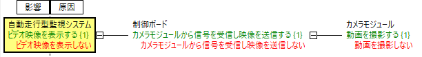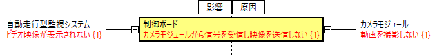 フォーカスエレメントに「制御ボード」の「カメラモジュールから信号を受信し映像を送信しない」を指定して、影響には「自動走行型監視システム」の「ビデオ映像が表示されない」を、原因には「カメラモジュール」の「動画を撮影しない」をそれぞれ接続します。