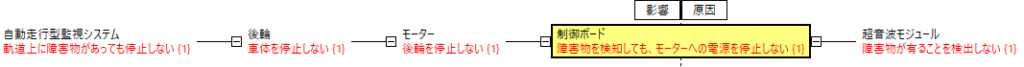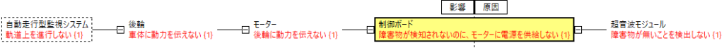 まず、「制御ボード」の「障害物を検知しても、モーターへの電源を停止しない」に着目します。この「原因」は、超音波モジュールの「障害物が有ることを検出しない」になります。「影響」については、モーターの「後輪を停止しない」になります。接続すると、モーターの故障ネットが以下のように継承されます。