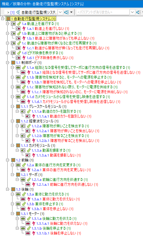 以上で、すべての故障とその関係を設定することができました。「機能/故障解析」ボタンをクリックして入力した機能を一覧で表示すると、「故障」アイコンの塗りつぶしが4種類あることがわかります。各アイコンをダブルクリックすると、フォーカスエレメントとする故障ネットエディタが表示されます。それぞれ内容が矛盾なく記述されているかご確認ください。