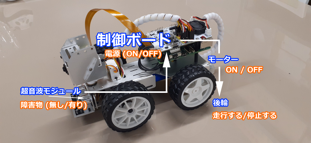| 超音波モジュール | 障害物が無いことを検出する | 障害物が無いことを検出しない | 障害物が有ることを検出する | 障害物が有ることを検出しない |