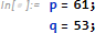 安全性を保つには p, q に大きな素数を選ばなければなりませんが、ここでは動きを見るために小さな素数を選択します。