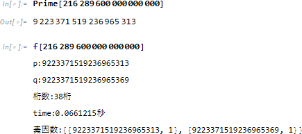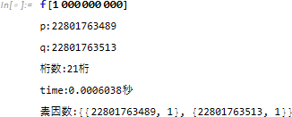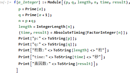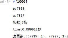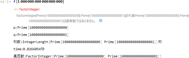 まず、a を 3000 とすると、7912、3001番目の素数は 7927 となり、n は 8 桁の数となることが確認できます。なお、桁数は IntegerLength を使うことで確認できます。そして FactorInteger でその素因数を求めてみると、ほぼ 0 秒で計算できていることが分かります。