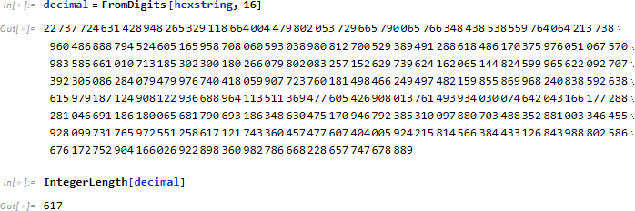 これを FromDigits を使って 10進数に変換してみると、600桁を超えていることが確認できます。