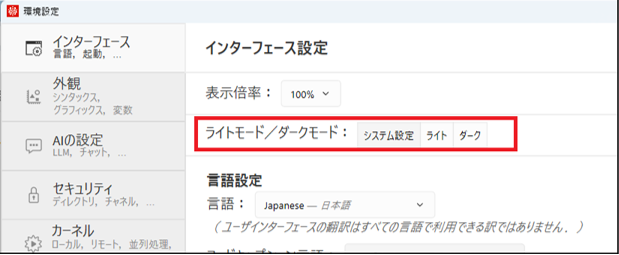 編集 メニューから 環境設定 を開き、インターフェース設定 の ライトモード/ダークモード で設定を変更することもできます。