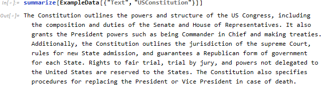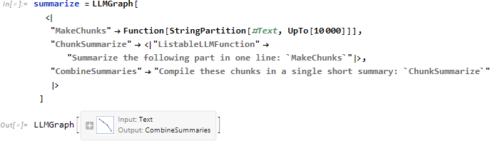 次の例は Wolfram 言語関数を使用してテキストをチャンクに分割し 、要約を行うために LLM 関数を並列実行し、最後に別の LLM 関数を実行してすべてのチャンク要約から単一の要約を作成します。