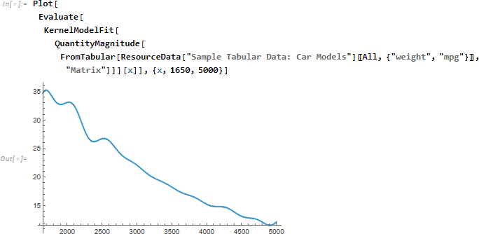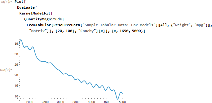 KernelModelFit は指定されたカーネル関数を使って局所化されたデータのフィッティングを行います。 デフォルトではカーネルはガウス分布で、その数と幅は自動的に選択されます。
