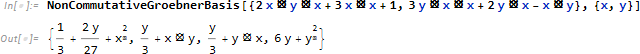 NonCommutativeGroebnerBasis は非可換代数上で多項式集合のグレブナー基底を計算します。