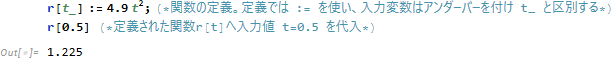 例4:念のために、時刻 t=0.1s における距離 r(0.1) の正解が 0.049m かどうか、Mathematica に出力させよう。