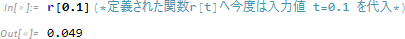 正解 0.049 を出力している。例3にあった「関数の定義 r[t_]:= … 」の記述は、既に Mathematica に覚えさせた状態になっているため省略できる。このような再利用可能性も、関数の利便性の一つだ。
