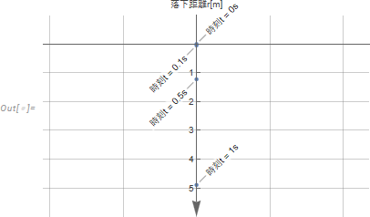 以上で扱った時刻 tに対し、縦軸を落下距離に取ると以下のように図示できる。