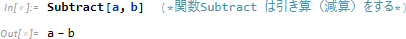 先ほど定義した r[t] は入力する変数が1つなので「1変数関数」であり、この Subtract[a,b] は入力変数が a と b の2つなので「2変数関数」と呼ぶ。2変数関数の出力値は、2つの入力変数 a, b の両方の値に依存して変化するのが特徴だ。それは引き算 a – b をご存じの皆さんなら分かるだろう。この2変数関数が微分の理解に必要になる。