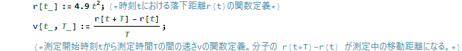 関数の例として、物体の落下を紹介しよう。時刻 t [s] における落下距離 r [m] を関数 r(t) として以下のようにあらわす。