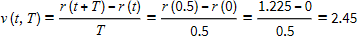 つまり速さ 2.45 m/s だ。実際、例1、例3から、測定開始時刻 t=0s と終了時刻 t + T = 0.5s においてそれぞれ r(0) = 0m, r(0.5) = 1.225m なので、