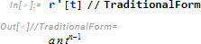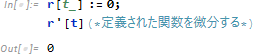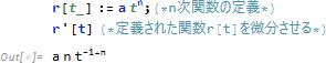 例8:n 次関数 r(t) = a t n を微分すると r‘ (t) = an tn-1 になることを、Mathematica に出力させよ。